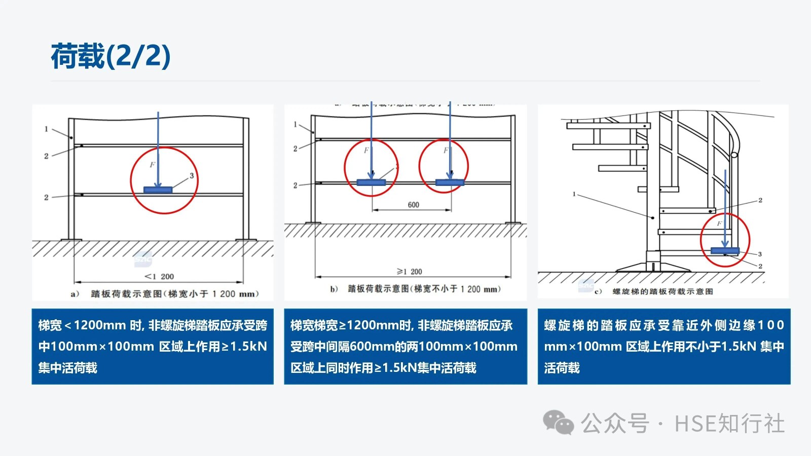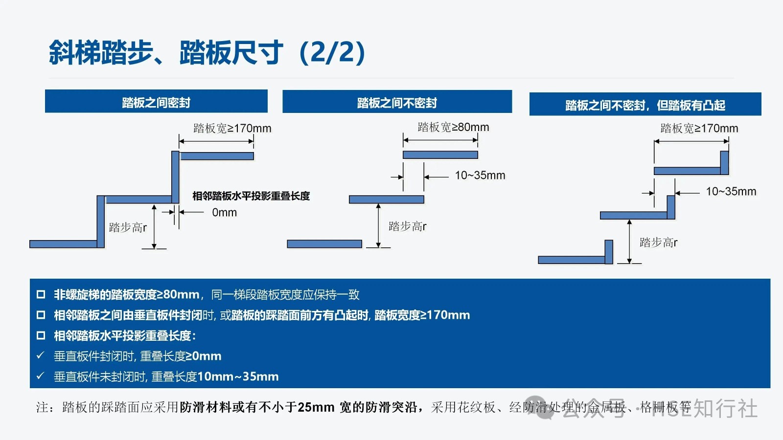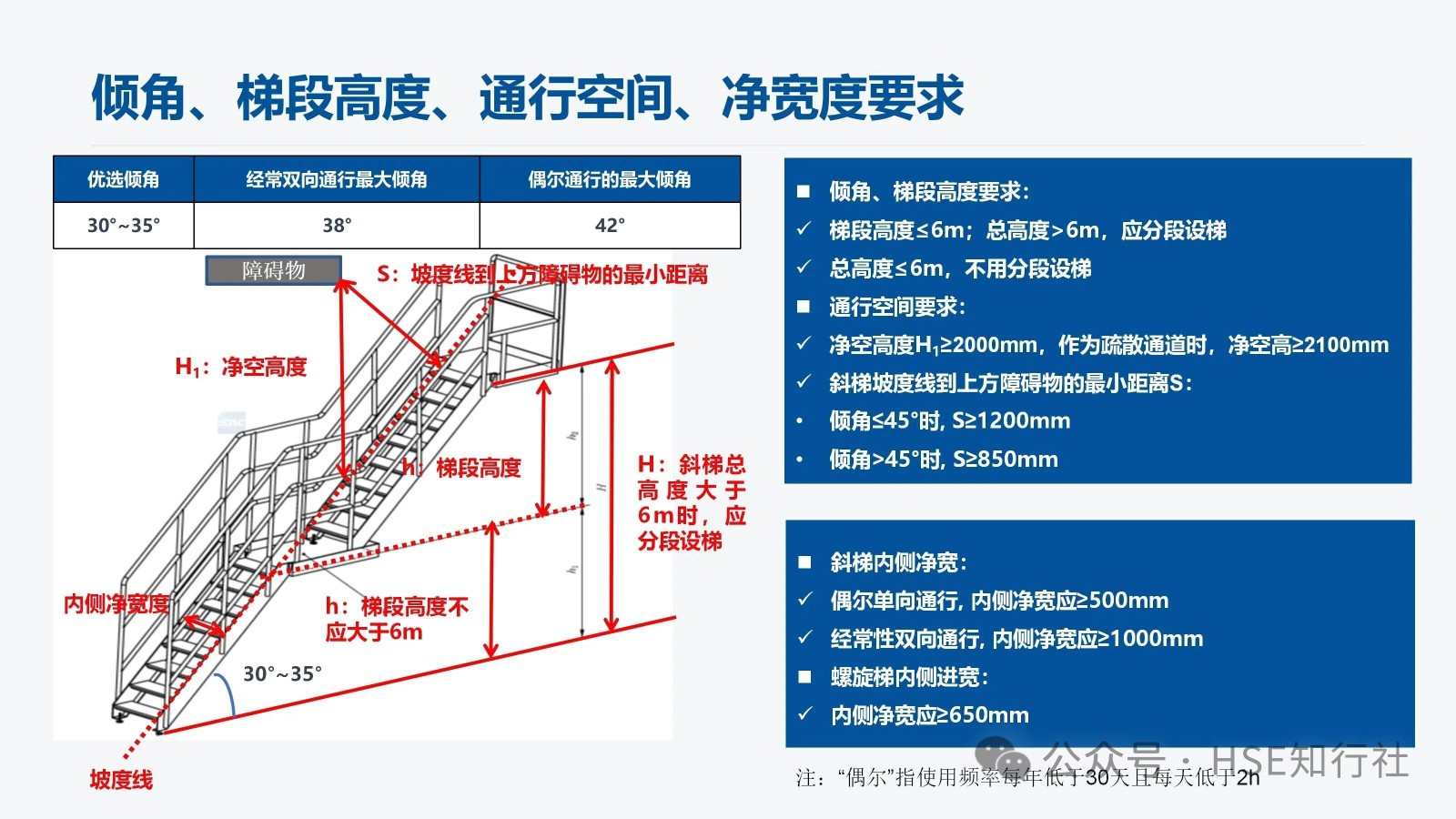 适用范围 适用于工业企业内工作场所中使用的固定式金属斜梯的设计、制造和安装。不适用于安装在核设施、船舶、 起重机械、输电塔上的固定式金属斜梯。 倾角、梯段高度、通行空间、净宽度要求 倾角、梯段高度要求: 梯段高度≤6m;总高度>6m,应分段设梯。 总高度≤6m,不用分段设梯。 通行空间要求: 净空高度:H1≥2000mm,作为疏散通道时,净空高≥2100mm 斜梯坡度线到上方障碍物的最小距离S: 倾角≤45°时, S≥1200mm 倾角>45°时, S≥850mm 斜梯内侧净宽: 偶尔单向通行, 内侧净宽应≥500mm 经常性双向通行, 内侧净宽应≥1000mm 螺旋梯内侧进宽: 内侧净宽应≥650mm 注:“偶尔”指使用频率每年低于30天且每天低于2h。 倾角要求: 优选倾角:30°~35° 经常双向通行最大倾角:38° 偶尔通行的最大倾角:42° 斜梯踏步、踏板尺寸 平台设置要求: 1、斜梯的踏步宽与踏步高的组合值L计算: 550mm≦L=g+2r≦700mm g——踏步宽,单位为毫米(mm) r——踏步高,单位为毫米(mm) 2、常用的斜梯倾角与踏步宽、踏步高尺寸组合(L =600mm时): 倾角 30° 35° 40° 45° 50° 55° 60° 65° 70° 75° 踏步高(r) 160 175 185 200 210 225 235 245 255 265 踏步宽(g) 280 250 230 200 180 150 130 110 90 70 注:常用的斜梯倾角不低于30°,成人步距平均在600mm左右, 常用的L取值为600mm。 3、不同踏板形式的踏板宽度、相邻踏板水平投影长度也不相同,具体如下: 踏板之间封闭: 踏板之间不封闭: 踏板之间不封闭,但踏板有凸起: 非螺旋梯的踏板宽度≥80mm,同一梯段踏板宽度应保持一致。 相邻踏板之间由垂直板件封闭时, 或踏板的踩踏面前方有凸起时, 踏板宽度≥170mm。 相邻踏板水平投影重叠长度: 1、垂直板件封闭时, 重叠长度≥0mm 2、垂直板件未封闭时, 重叠长度10mm~35mm 注:踏板的踩踏面应采用防滑材料或有不小于25mm 宽的防滑突沿,采用花纹板、经防滑处理的金属板、格栅板等。 螺旋梯踏步、踏板尺寸 距离螺旋梯扇形踏步窄边300mm处的踏步宽应不小于170mm。 螺旋梯的踏步高应在160mm~240mm范围内。 螺旋梯同一梯段踏板的平面投影圆心角应保持一致(梯段顶部踏板除外)。 防护栏杆与扶手 防护栏杆设置: 当斜梯侧面敞开边缘的临空高度≥1200mm时, 敞开边缘应设置防护栏杆。 倾角≤45°的斜梯, 防护栏杆立柱应垂直于踏板, 并从第一级踏板起始设置。 倾角>45°的斜梯: 1、防护栏杆立柱垂直于踏板时, 立柱从第一级踏板起始设置。 2、防护栏杆立柱垂直于起坡线时,起始位置设置要满足以下要求: 下方工作面有防护栏时,起点与防护栏顶部横杆连接。 下方工作面无防护栏时,起点距离工作面竖向距离≤1200mm。 立杆垂直于起坡线,下方有护栏 立杆垂直于起坡线,下方无护栏 扶手设置: 扶手设置主要根据斜梯的倾角、斜梯的梯宽来设置,设置要求如下图: 斜梯防护栏杆高度≤1200mm时, 顶部横杆兼做扶手。 单独设置斜梯扶手时, 扶手竖直高度为860mm~1000mm。 扶手起始点距离地面或平台的垂直距离应≤1000mm。 梯间平台与门 梯间平台: 1、梯间平台宽度应不小于梯子宽度, 对斜梯应不小于760mm 。 2、梯间平台在行进方向上的长度应不小于梯子宽度, 对斜梯应不小于850mm。 3、梯间平台要符合GB4053.3—2025的规定。 自闭门: 1、自行关闭、保持在关闭位置但不锁定。 2、采用平开方式向平台内打开、打开角度不小于 90°。 3、关闭时由挡块阻挡,防止人员推开发生坠落或其他意外伤害。 4、不设置踢脚板、底部距离平台高度为120mm~500mm。 5、自闭门要符合GB4053.3—2025的规定。 荷载 梯梁、踏板、顶部横杆、中间杆、立柱荷载如下: 1、梯宽<1200mm 时, 非螺旋梯踏板应承受跨中100mm×100mm 区域上作用≥1.5kN集中活荷载。 2、梯宽梯宽≥1200mm时, 非螺旋梯踏板应承受跨中间隔600mm的两100mm×100mm区域上同时作用≥1.5kN集中活荷载。 3、螺旋梯的踏板应承受靠近外侧边缘100 mm×100mm 区域上作用不小于1.5kN 集中活荷载。 使用说明和警示信息 斜梯的使用说明和警示信息,主要从“斜梯的使用说明”、“斜梯的警示信息”、“自闭门的警示信息”三方面来完善,同时涉及到的安全色和安全标志应符合 GB2894 的规定。 1、斜梯的使用说明,包括但不限以下内容: a) 斜梯、平台的最大允许荷载.。 b) 自闭门的安全使用信息。 c) 维护和检查的要求。 需要设计、制造方提供使用说明。 2、斜梯的警示信息,包括但不限以下内容: a)最大荷载信息(包括允许的最大负载人数、工具和装备等最大附加荷载)。 b)人员攀登时的安全要求(例如当心坠落、必须戴安全帽等)。 3、自闭门的警示信息,包括但不限以下内容: a)禁止倚靠的信息。 b)小心坠落的信息。 c) 提示非通行状态保持关闭。