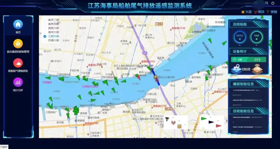 2022年1月1日,江苏海事局船舶尾气排放遥感监测系统上线试运行,在长江江苏段6座大桥建设23套船舶尾气排放检测设备,该系统覆盖过往船舶更全、遥感监测种类更多、现场执法效率更高。近日,江阴海事局查获该系统运行以来首起在航船舶燃油超标违法行为,并对监测系统中抓拍的3艘船舶尾气明显黑烟情况通报其船公司。1月6日,江阴海事局执法人员在收到系统自动报警后,立即组织人员对“军**”轮开展了船舶燃油取样并实施硫含量快速检测,后经专业机构检测硫含量为0.61%m/m,燃油含硫量明显超标,该行为违反了《中华人民共和国大气污染防治法》相关规定,江阴海事局依法对其实施了行政处罚。江阴海事局通过黑烟抓拍子系统报送的报警信息进行研究分析,决定对黑烟状况明显的3艘船舶所属船公司下发《船舶黑烟污染防治建议书》,要求其认真排查船舶主机工况、燃油使用等情况,切实采取措施消除船舶黑烟,并在规定时间内反馈整改情况。在长江江阴段辖区,依托江阴长江大桥架设了3套采用光谱、嗅探等不同工作原理的硫含量监测、黑烟抓拍等专业设备,船舶尾气排放遥感监测系统成为江阴海事局深化建设船舶污染防治“江苏模式”江阴样板区、精准防治船舶尾气污染、助力打赢蓝天保卫战的科技利器。