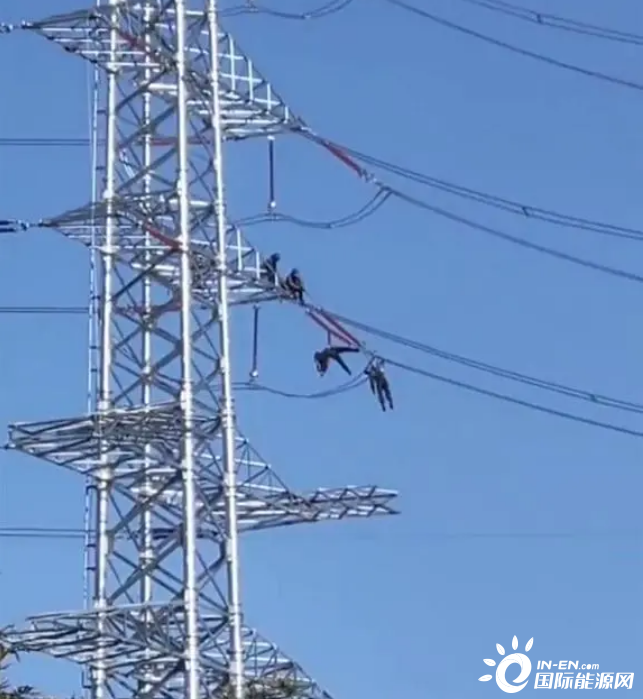 网友拍摄的视频内容显示,在一道路附近的高压线杆上,两名人员的身体悬挂在线缆上一动不动,疑似发生触电事故,一旁则是架设的高压电力设施。极目新闻记者注意到,两名人员身穿黑色衣服,头戴安全帽,因事发地位于道路交叉口,附近来往行人和车辆较多,不时有市民在一旁围观。