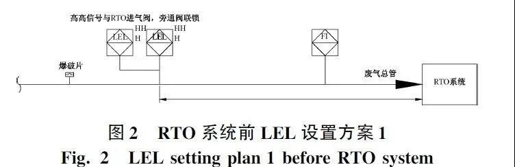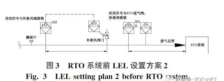 根据相关工程经验,RTO前LEL检测设备一般选择FID(氢离子火焰)或FTA(火焰温度分析)型。其中FID型仪器对碳氢化合物较为灵敏,对CO/CS2/NH3/H2等可燃物基本不响应,而FTA型仪器灵敏度最高,应用范围最广,但价格也较贵。企业可根据自身情况选择合适的仪器类型。RTO前LEL的设置一般有两种设计方案,见图2和图3: