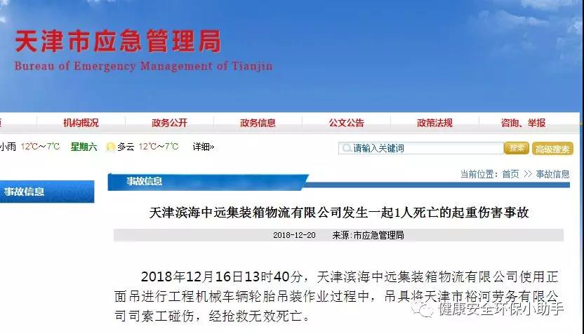 事故通报:2018年12月16日13时40分,天津滨海中远集装箱物流有限公司使用正面吊进行工程机械车辆轮胎吊装作业过程中,